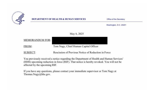“You previously received a notice regarding the Department of Health and Human Services’ (HHS) upcoming reduction in force (RIF). That notice is hereby revoked,” read the letter received by some workers at the World Trade Center Health Program, which provides health care services to 9/11 first responders and survivors.