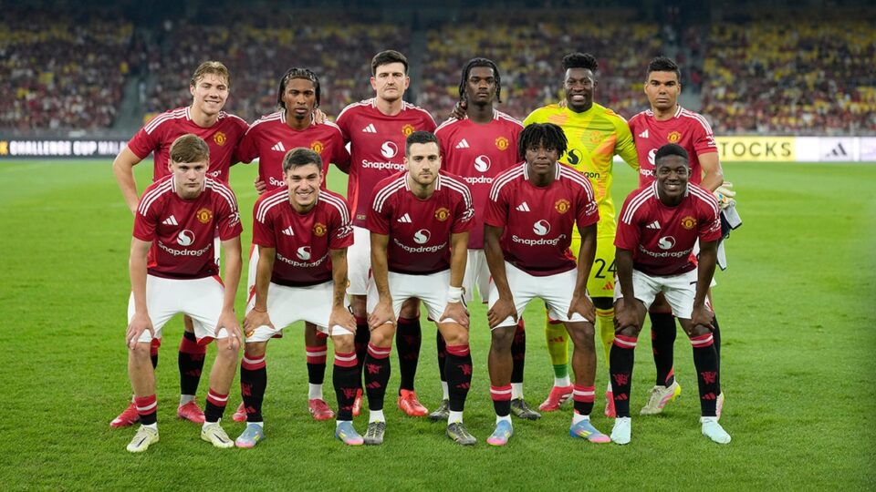 Manchester United’s team poses before a friendly match with ASEAN All-Star team during the Challenge Cup tournament in Kuala Lumpur, Malaysia, Wednesday, May 28, 2025. (AP Photo/Vincent Thian)