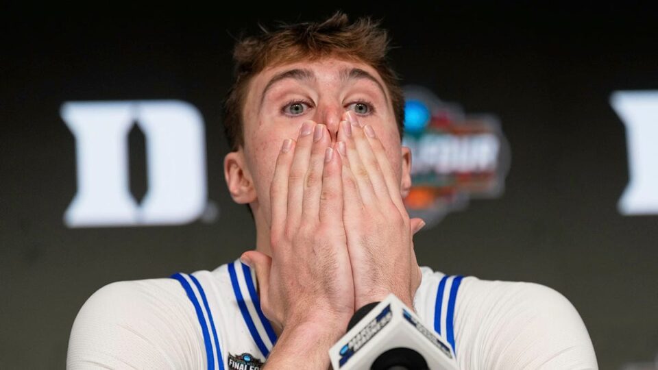 Duke’s Cooper Flagg wipes his face during a news conference after Duke lost to Houston in the national semifinals April 5, 2025, in San Antonio. (AP Photo/Eric Gay)
