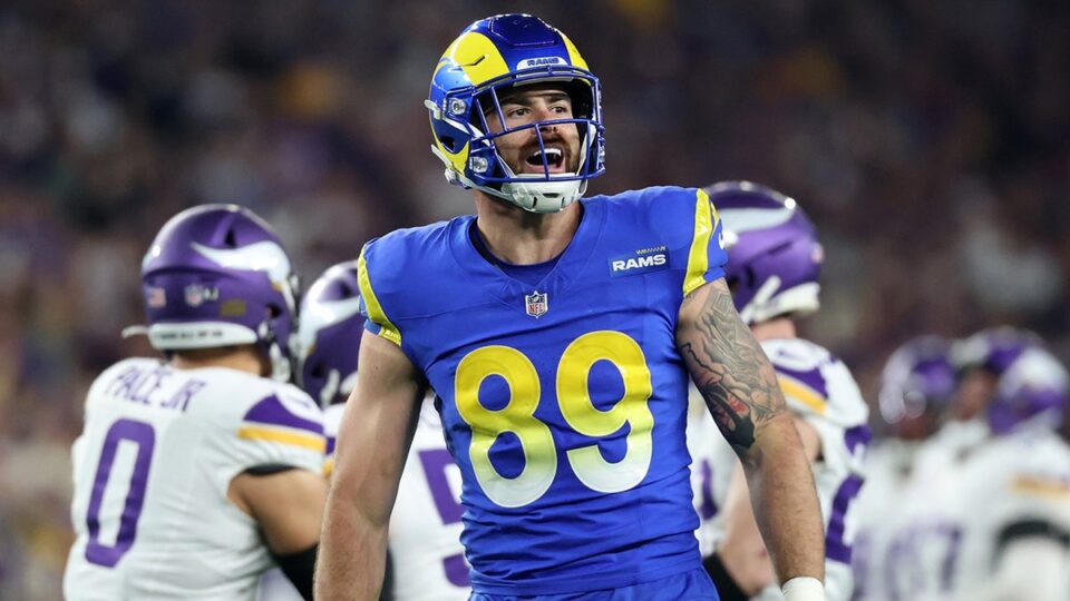 Los Angeles Rams tight end Tyler Higbee, #89, reacts after a catch against the Minnesota Vikings during the first half of an NFC wild card game at State Farm Stadium in Glendale, Arizona, on Jan. 13, 2025. (Mark J. Rebilas-Imagn Images)