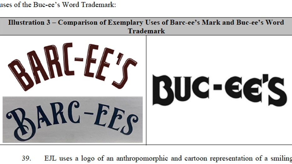 An illustration in the Buc-ee’s lawsuit against Barc-ee’s shows the word trademarks side-by-side. (United States District Court Western District of Missouri Southern Division / Fox News)