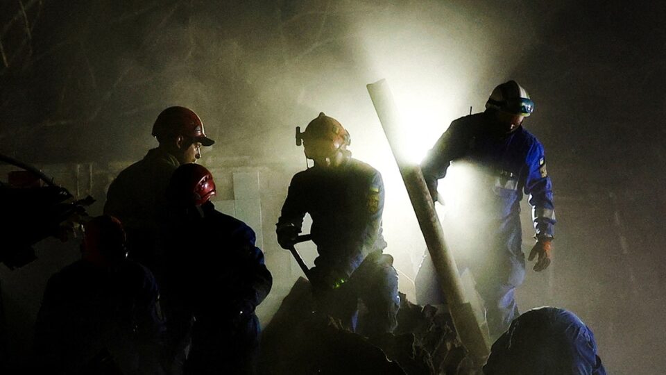 Rescuers work at the site of an apartment building hit by a Russian ballistic missile strike, in Kyiv